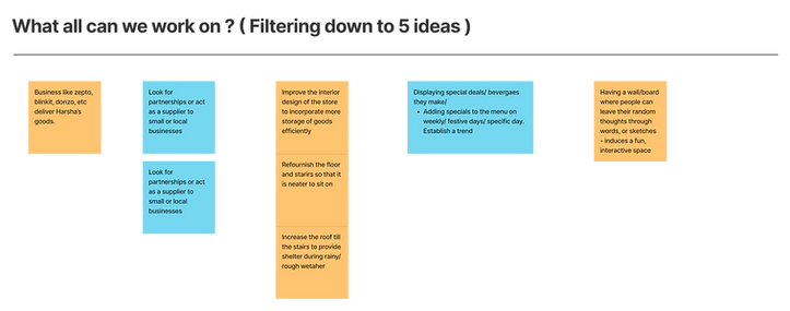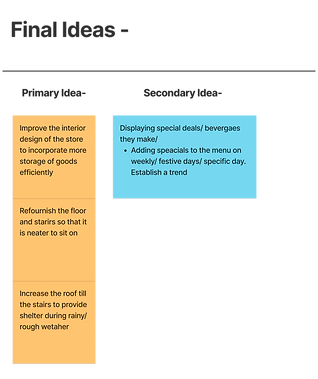 The refined ideas aim to elevate the overall experience at Harsha Bakery by optimizing storage and expanding the product range to attract a broader user base. Additionally, proposals include refurbishing the floor and stairs to create a more appealing seating area for customers, extending the roof to offer shelter during Bangalore's unpredictable weather conditions, featuring special deals and beverages for promotional visibility, and introducing weekly or festive specials to establish an alluring trend and communicate the diverse offerings available at the bakery.